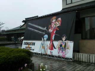 会場はなんとなく頭ではわかっていたものの(私の車にカーナビなんてものはない)不確かだったのですが、「ま、行けば案内ぐらいあるだろう」のいつものノリで行ってみると、エヴァっぽいのぼり発見。